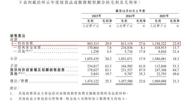 纪念高增长的前锋珠宝并未告捷拉动公司的全体毛利率。据招股书露出,该项毛利率从2023年的29.9%降至2025的22.9%。