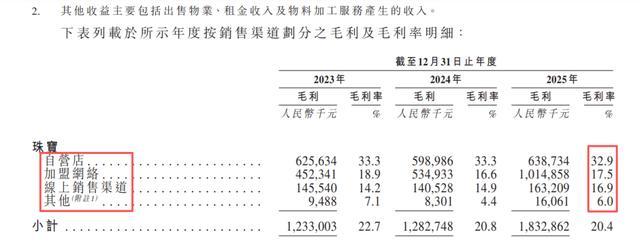 加盟店的优点明确,缺欠也禁绝冷落。招股书露出,2025年,潮宏基珠宝业务加盟代理销售时势的毛利率仅为17.5%,自营、收罗销售时势的毛利率为34.9%、16.9%。
