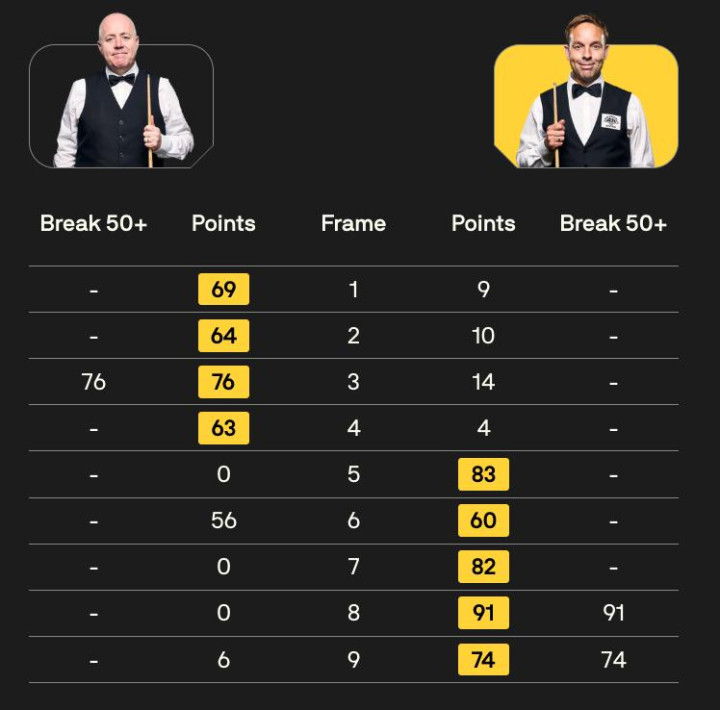 比赛首局,希金斯以69:9拿下该局,取得开门红。第二局,霍金斯屡次送出大礼包,希金斯以64:10再下一局。第三局,希金斯打出单杆76分,终了单杆制胜。第四局,希金斯乘胜逐北,以63:4再下一局,大比分4-0梦境开局。第五局,霍金斯手感上线,以83:0扳回一局。之后,以60:56和82:0再下一局,大比分4-3暂时落伍。重要终末两局,霍金斯单杆制胜智商栽培,打出单杆91分和74分,连胜两局,大比分5-4反超比分特出。