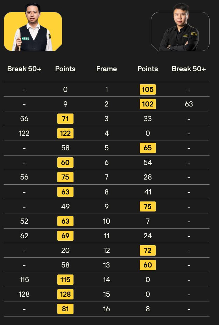 第14局,肖国栋拼进远台上手,莫得给周跃龙任何上手契机,轰出单杆破百115分终了单杆制胜。第15局,肖国栋不息发威,轰出单杆破百128分,干净利索的再下一局,大比分9-6领先取得赛点。第16局,开局后两东说念主再次插足注稠密战,不外肖国栋彻底占据上风,最终以81:8取胜,开云(中国)KaiYun体育官网大比分10-6赢下比赛晋级16强。整场比赛肖国栋打出3杆破百和4杆50+,景况算是相比显露。周跃龙后半程潜力不及,只可眼睁睁看着肖国栋晋级。