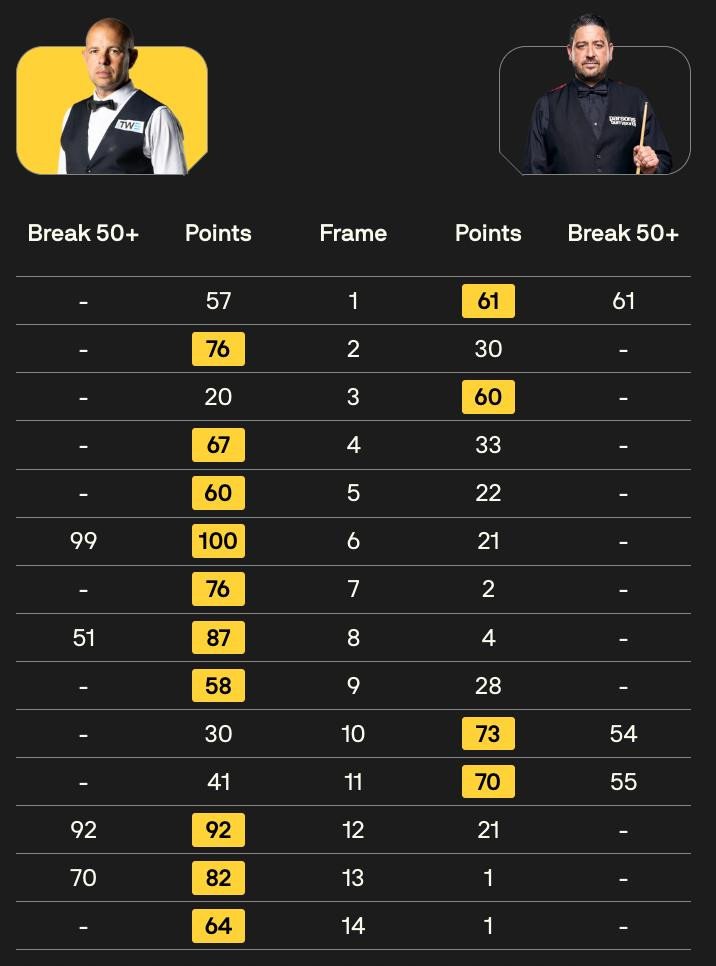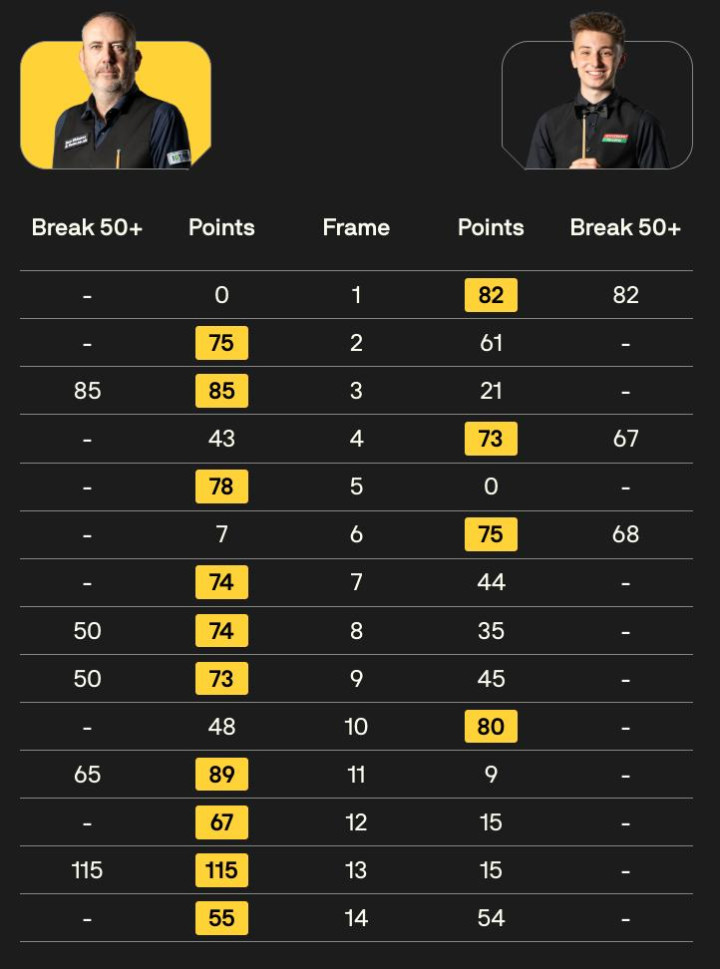 第14局,两东说念主进行了遥远间缠斗,科瓦尔斯基本有契机拿下该局,开云app可惜重要时刻灭打发压力,马克.威廉姆斯以55:54赢下该局,大比分10-4取胜晋级。从比分看,马克.威廉姆斯取得大捷,然则比赛经过并不堪利,其打出1杆破百和4杆50+,因为敌手太弱,莫得给他制造太多艰难。